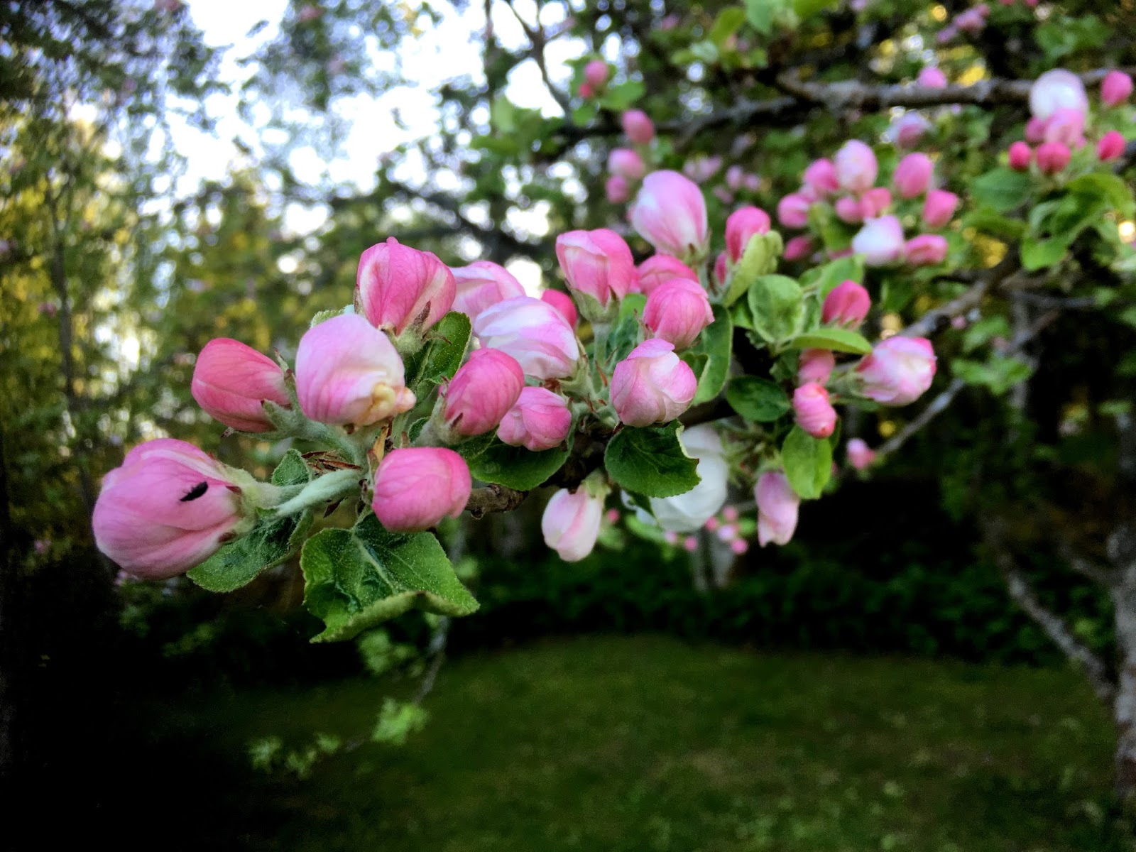 Tänk att detta gamla träd där kvistarna nätt och jämt håller ihop och det växer massor av mossa på grenarna, tänk att alla dessa vackra blommor orkar växa där och att det en dag om några månader kommer att växa ut smarriga röda äpplen!! Det ger så mycket liv, energi och kärlek! Det behöver vi nu, i alla fall jag!! Massor!!;-)